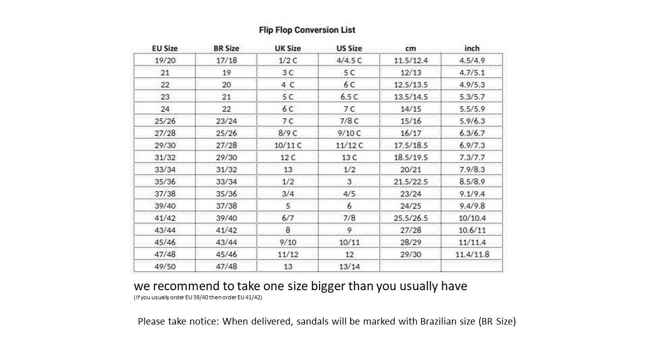 Havaianas merkillä on brasilialaiset koot, katso kokotaulukosta mikä koko vastaa EU kokoa.
